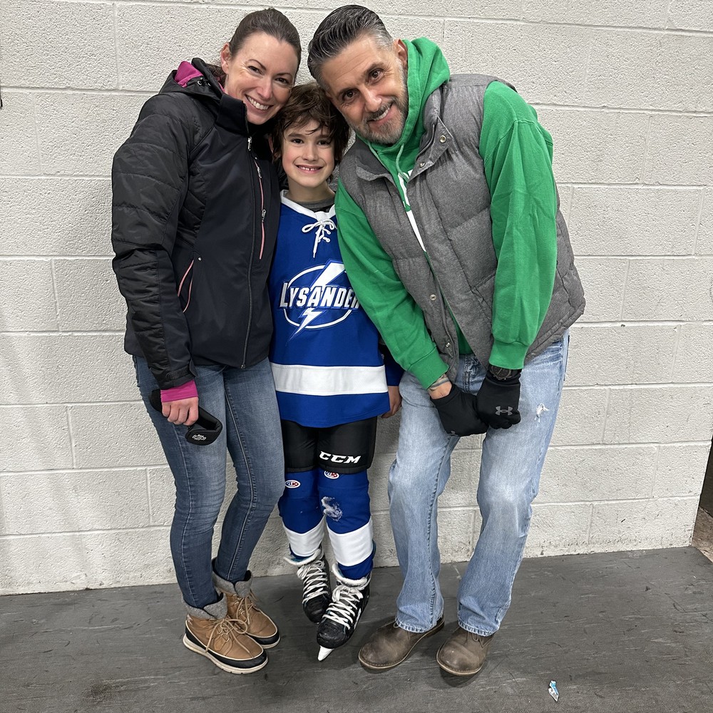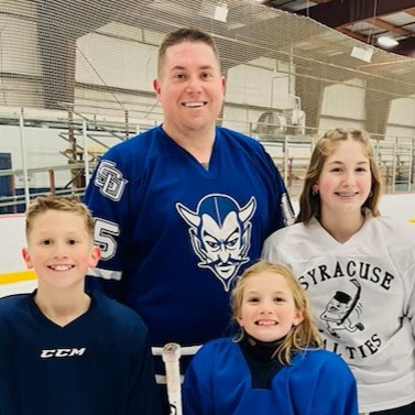 Chris lives in Baldwinsville with his wife Jenna, daughter Annabelle, and sons River and Liam. Chris’ family is by definition, a bunch of rink rats through and through: In addition to coaching his son’s team, Chris plays Men’s league hockey at Lysander; his daughter Annabelle is a nationally ranked figure skater; and Jenna, also a high-ranking competitive figure skater, has coached figure skating for the last twenty years. Liam has dabbled with skating but feels more at home cheering on his sister and brother from the bleachers with the other Lysander fans.